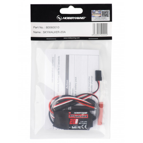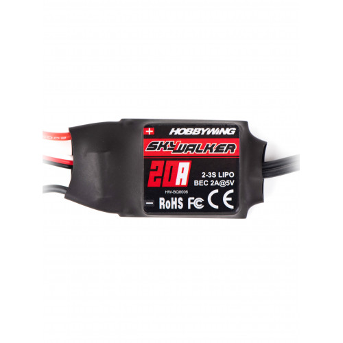 Бесколлекторный безсенсорный регулятор Walker 20A от компании HobbyWing. 20А в названии означает максимальный постоянный ток. Кратковременный пиковый ток устройства – 25А. Питание регулятора SkyWalker 20AE происходит от 2-3S LiPo.