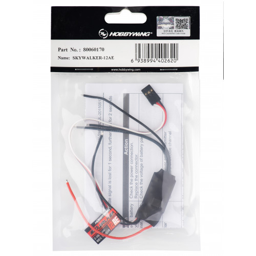 Бесколлекторный безсенсорный регулятор Walker 12AE от компании HobbyWing. 12А в названии означает максимальный постоянный ток. Кратковременный пиковый ток устройства – 15А. Питание регулятора SkyWalker 12AE происходит от 2-3S LiPo.