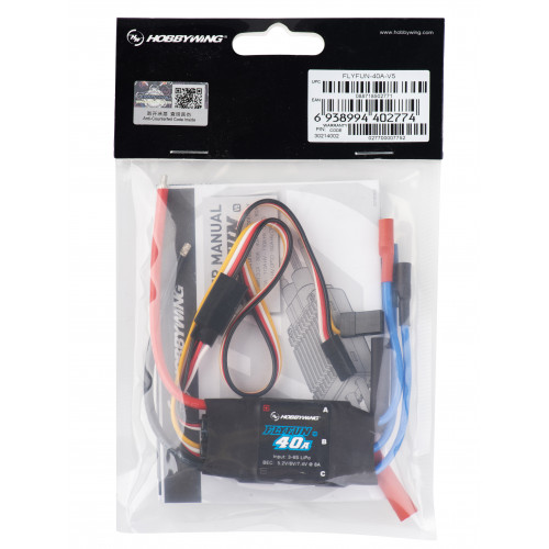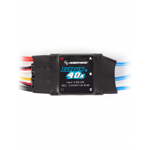 НОВИНКА от компании Hobbywing бесколлекторный безсенсорный регулятор FlyFun 40A V5. 40А в названии означает максимальный постоянный ток. Кратковременный пиковыый ток устройства – 60А. Питание регулятора FlyFun 40A V5 происходит от 3-6S LiPo.