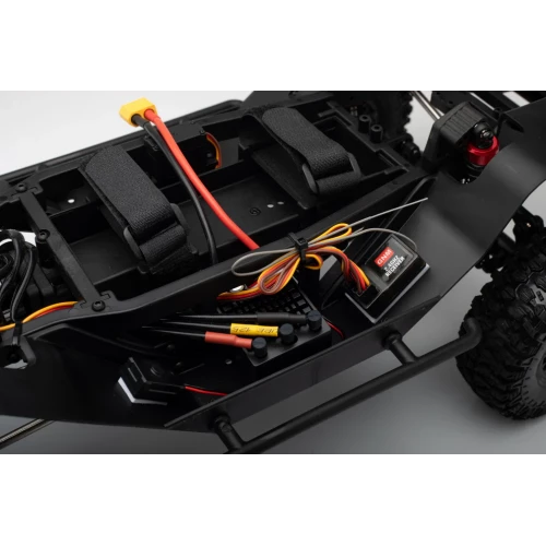 - Рама выполненная и высокопрочного пластика с уникальной геометрией для максимально низкого центра тяжести. Все компоненты: Новый Gearbox ( 2-х скоростная трансмиссия с раздаточной коробкой ) является одним целым и спроектирован для максимального снижения центра тяжести, регулятор, и сервоприводы управления и тормоза заднего моста установлены внутри рамы. Над Трансмиссией располагается новый батарейный отсек с адаптером для батарей разной длинны. для настройки развесовки можно использовать опциональные грузы которые продаются отдельно.